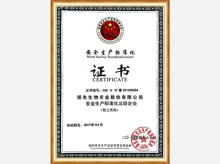 安全生產(chǎn)標(biāo)準(zhǔn)化企業(yè)證書(shū)
